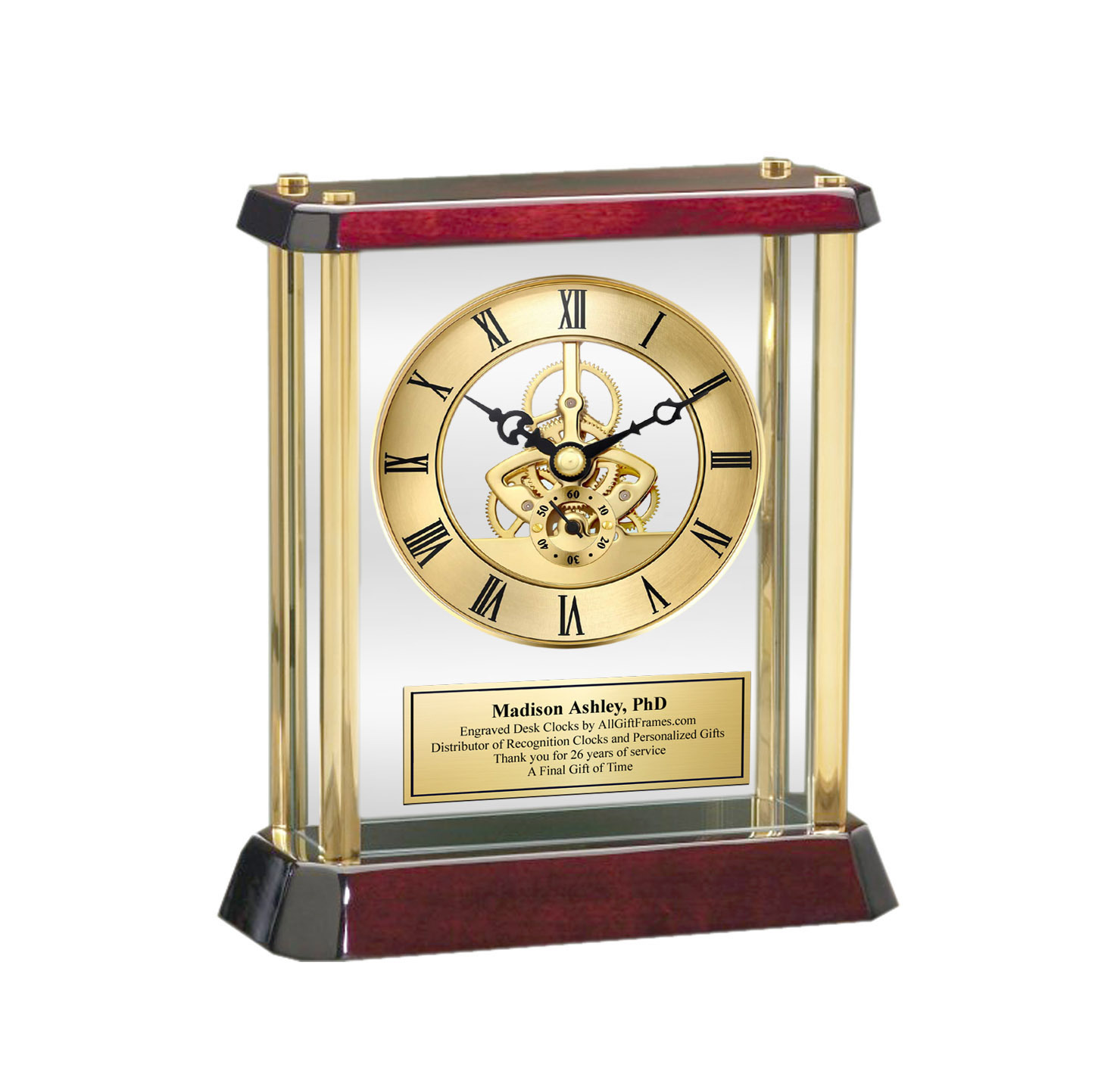 The vast expanse of optically clear glass case is radiant thanks to the precisely design. The Regal Clock, with its top and bottom polished wooden base, along with a gold engraving plate, will let your words of congratulations shine bright in a manner to inspire all. Forever recognized your retiree or coworker with a beautiful gold DaVinci desk clock as a symbol of recognition and excellence. This elegant roman numeral display clock will destine to outshine all other retirement gifts as it is functional and beautiful. The gold gear clock mechanisms move as the second, minute and hour hands rotates to tell time. The personalization option, with fused glass case and lustrous wooden base combination makes the clock a magnificent retirement gift of distinction. Here you have gentle metal gold curve trim and protective glass make the Regal clock an extraordinary timepiece. Without question, this engraved clock will be a stunning home or office décor. Sloping glossy wooden top and base of the clock are the perfect finishing touch of this gear clock. Gold Mantel Desk Table Clock Gear Dial Clock Suspended Glass Cherry Base with Brass Accents Modern Cool Home Office Timepiece Classic Unique Clocks Gift Tabletop. An incredibly beautiful home or office timepiece display that is a time-honored tradition for corporate employee retirement, recognition or employee service awards.