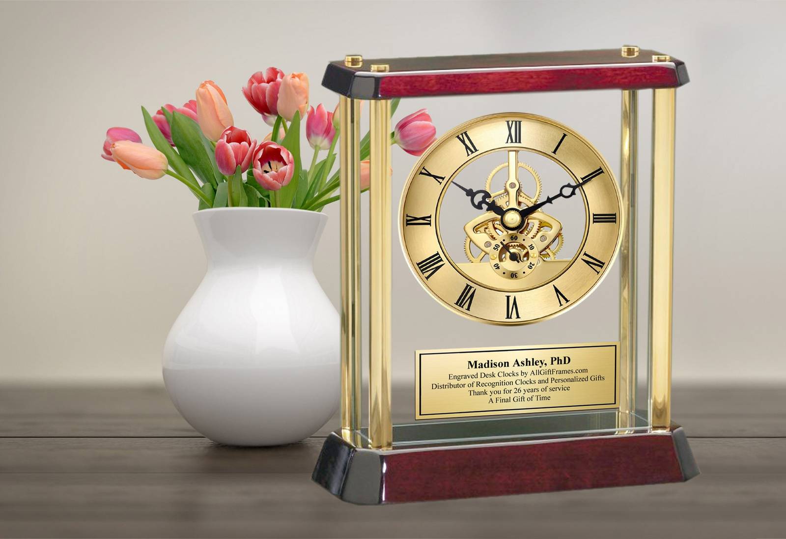 This engraved metal gold column desk clock offers a fresh perspective on a classic look with a DaVinci gear clock dial encased in glass. Features a table desk clock on shiny lustrous wood cherry base with elegant roman numerals complete its display. A handsome decoration for a coworker, employee, collegue, executive, boss or friend retirement of service award gift. This mantel desk clock also makes a mementos wedding, anniversary, birthday, graduation, promotion or birthday gift. Overall table mantel gear clock measures 10" x 8.5". Use this desk clock to display recognition in the office or pair it with coworker retirement mementos for memories. Employee Recognition Employee of the Year Month Executive Timepiece Clock Award with Silver Engraving Plate. We offer retirement clocks and employee recognition service awards gift clocks