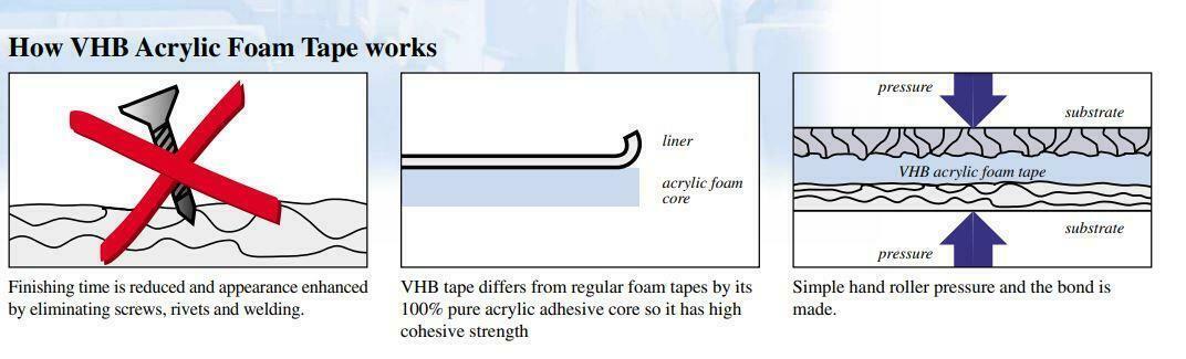 Cinta de montaje translúcida de doble cara, preaplicada. Ofrece una adhesión fuerte y poderosa. El adhesivo sensible a la presión se adhiere al contacto para proporcionar una resistencia a la manipulación inmediata