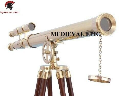 Crafted from solid brass, this telescope is mounted on a sturdy wooden tripod. The wooden tripod stand features wooden round legs, each with a screw release to let you adjust the height, and the brass chain holds the three wooden legs together so the telescope can maintain its. Which shines beautifully when placed in the sunlight. A sturdy wooden tripod supports the telescope when standing that adds class and sophistication to any room itโs in.