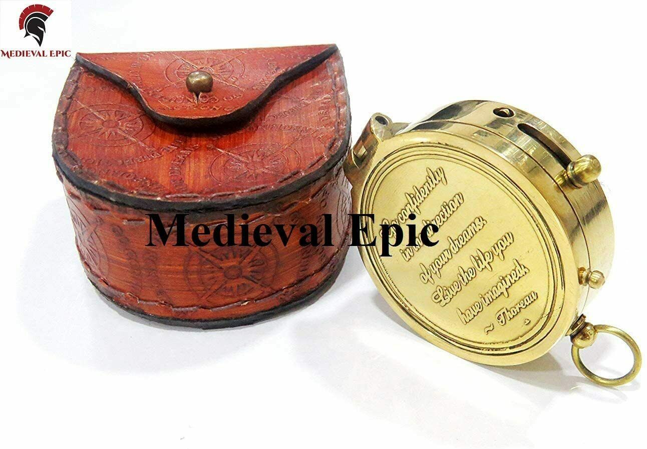 Medieval Epic Brass Compass Thoreau's Go Confidently Quote Engraved Compass with Embossed Leather case