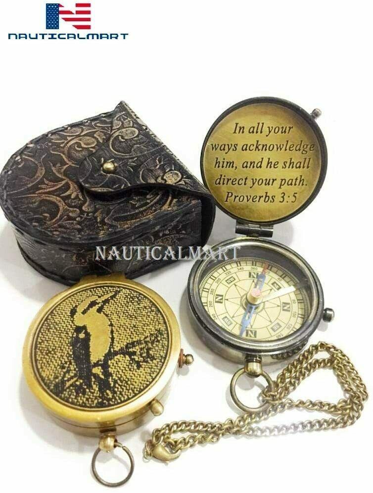 Brass Pocket Compass Sparrow Bird w/ Case Engraved In All Your Ways Acknowledge Him and He Shall Direct Your Path Proverbs 3:5 Directional Magnetic Navigational Nautical Compass Size-Compass: 2.5 x 2 x 0.8 inches. Perfect gift for any occasion: Duty to God award, missionary gift, Baptism gifts, confirmation gift. Our personalized brass compass would make a great gift for a loved one, friend, or co-worker for just about any occasion. Our compasses are made by hand out of soft brass metal and may have slight imperfections in a form of small dents, minor scratches, or tarnish spots that impart each compass with charm and character.