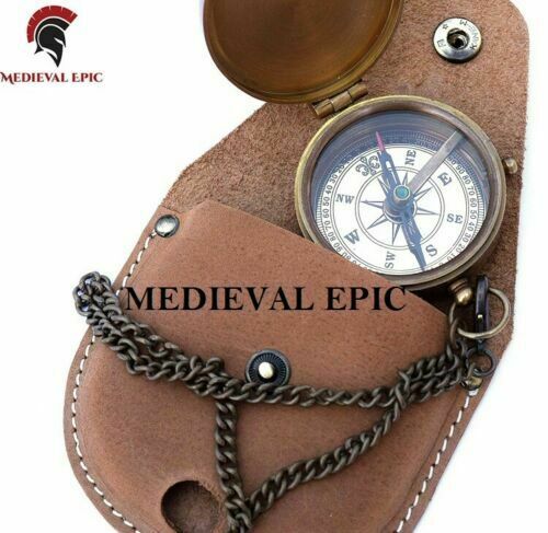 Brass compass with antique finish, detailed copper rose dial, real cow hide case.