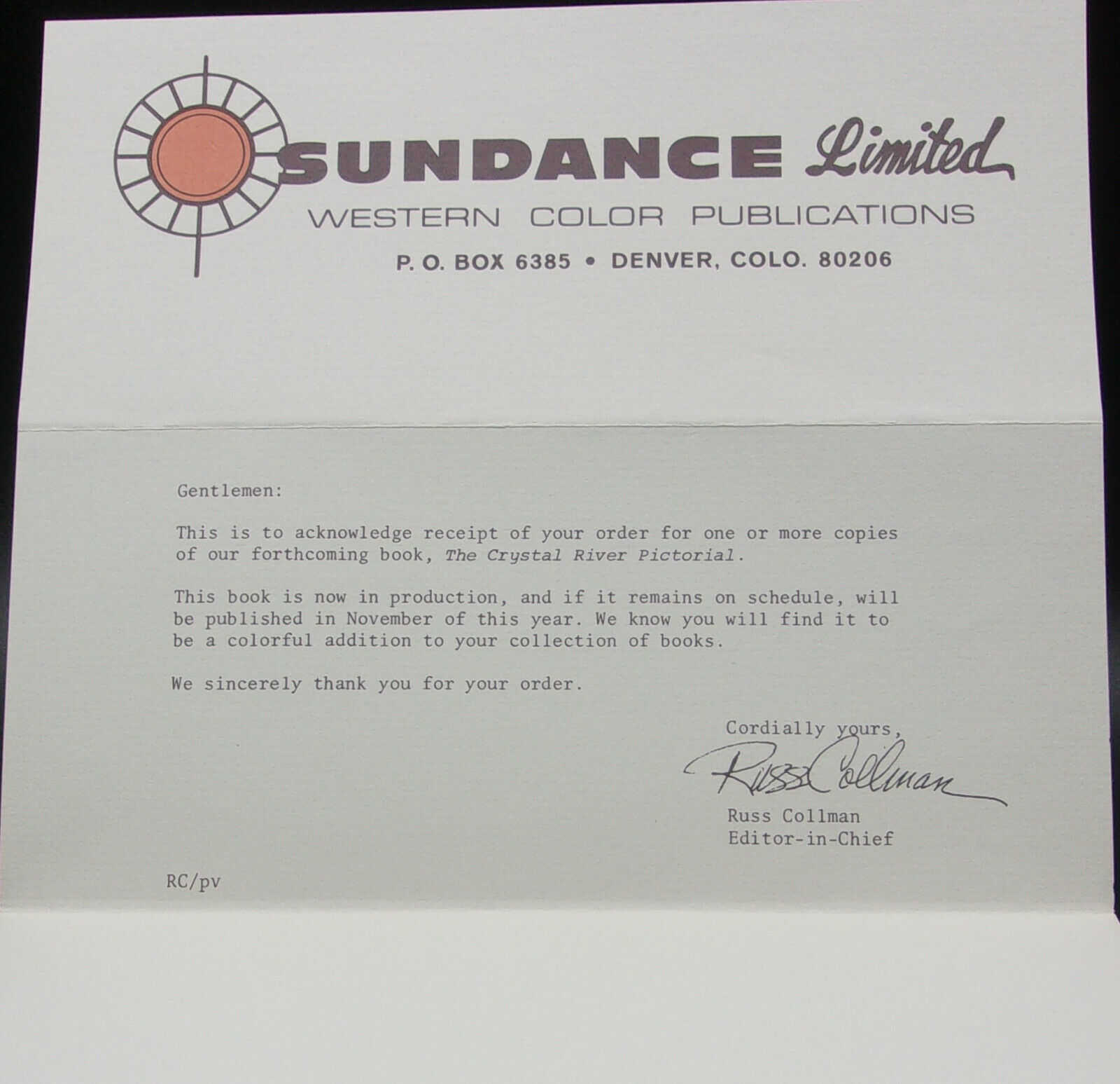 Laid in, also SIGNED by Russ Collman as editor in chief, is a typed letter on printed Sundance Ltd. letterhead.