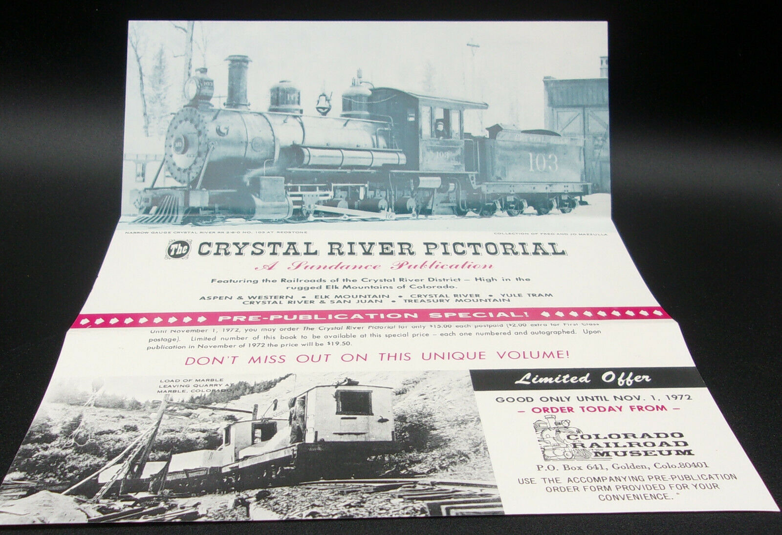 Extras laid in are: two glossy photograph reproductions, a Crystal Star Route souvenir folder, a typed letter SIGNED by Russ Collman, and a Sundance Ltd. paid itemized invoice.