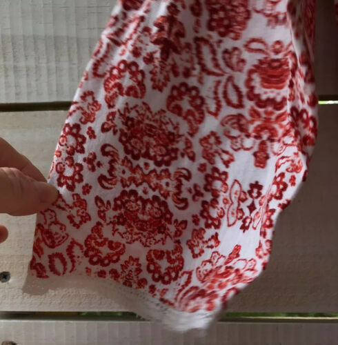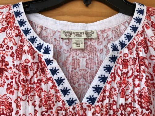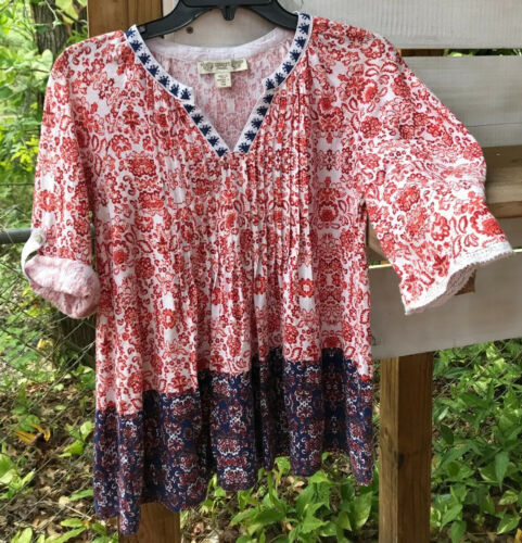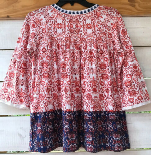 Vintage America Blues Women’s XS Flor de Lis Floral Boho Knit Top Lace Trim adjustable button roll-up 3/4 sleeves ~ Cross-stitched accent V-neck trim ~ Smocked chest for forgiving flowing fit/subtle ruched upper back on reverse. Top shoulder to base hem measures approx. 24"; lying flat across front chest/bust is 17" (totaling 34" all around including both front back, unstretched). Reminder, actually material not stated - but feels of knit blend so to stretch somewhat for extended fit. Made in India. Lovely Coral Rust Red, Blues White tones.