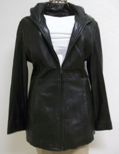 Oh so buttery soft, extremely supple, waist length, zip up front, 2 outside pockets, silky soft burgundy lining, leather jacket with hood!