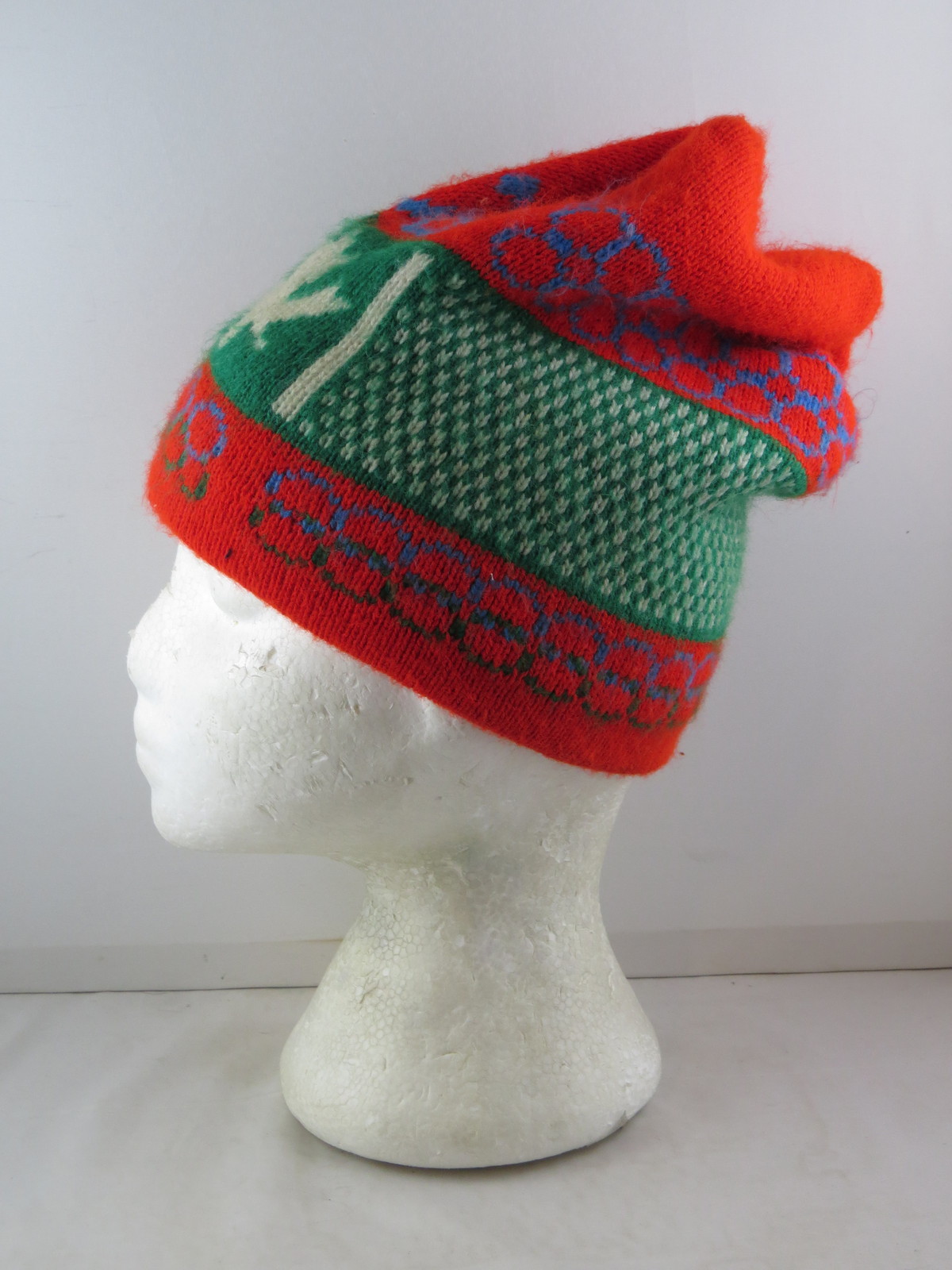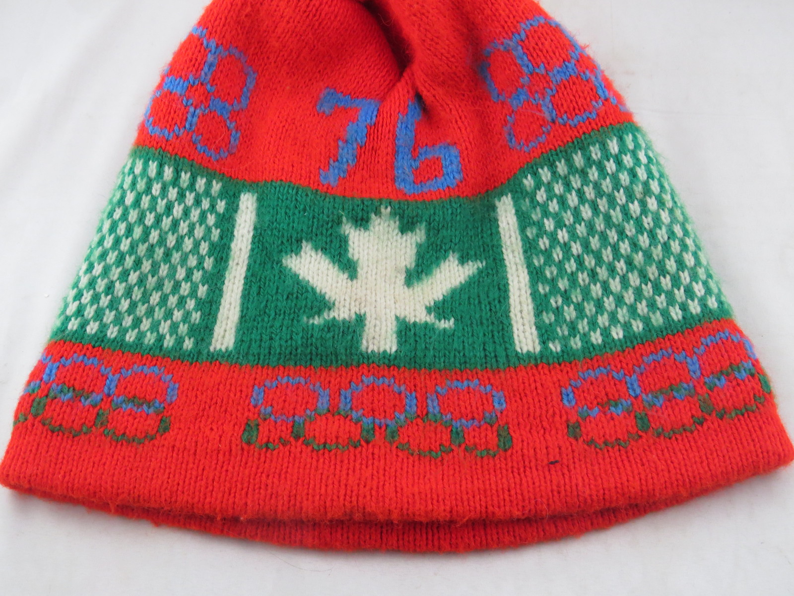 Up for sale is a vintage toque/beanie. It has a red base colour. The front of the toque has a green Canadian flag woven in with the sides wrapping around the entire toque. There are ring patterns above and below the flag design. There is 76 above the flag in the front of the toque. What a great vintage toque do not miss out on it.