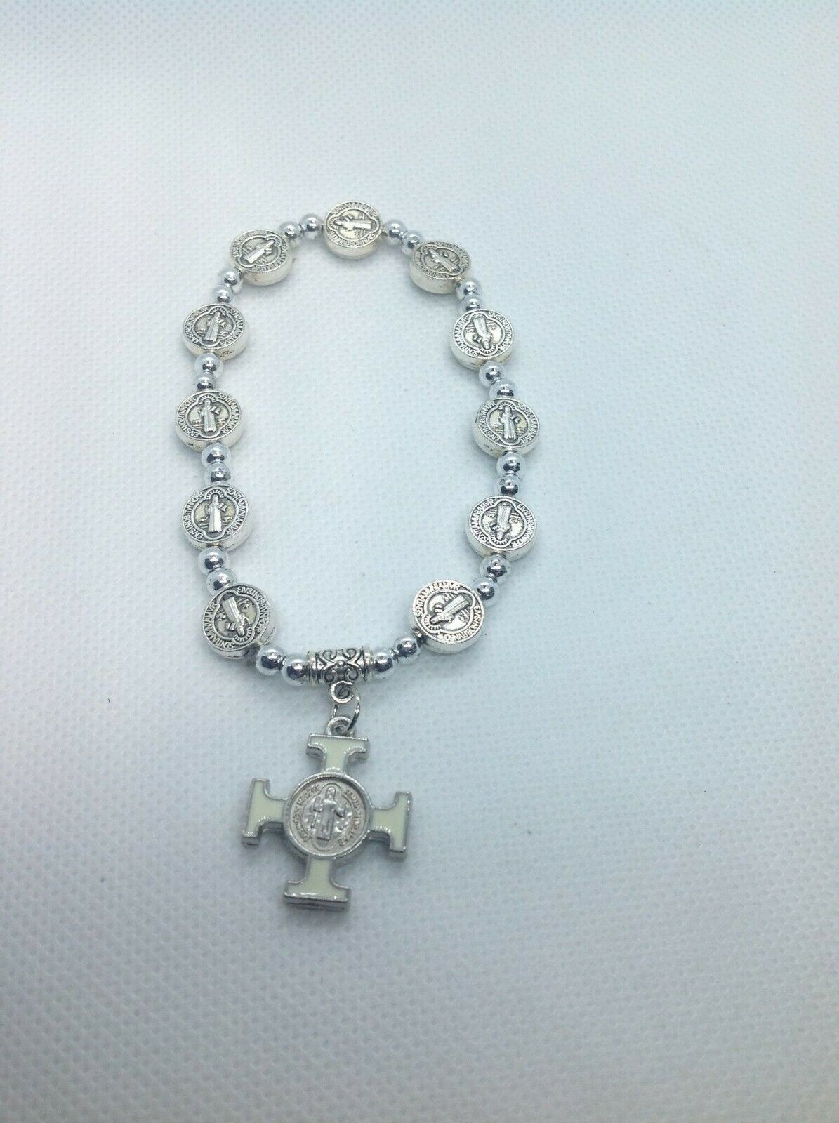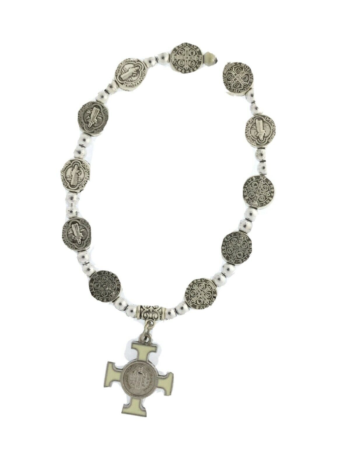 This rosary bracelet comes with 12 St. Benedict medals and a small crucifix.