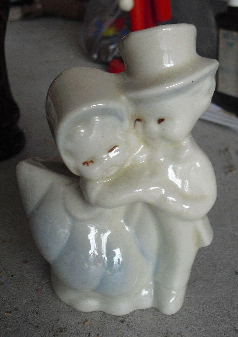 Very neat, vintage glazed ceramic, maybe even porcelain, I can't tell, smaller size, figural young boy and girl hugging planter in the picture. Nice shape with a little fine cleaning could be done. About 5 1/4 inches tall and 3 1/2 inches wide.