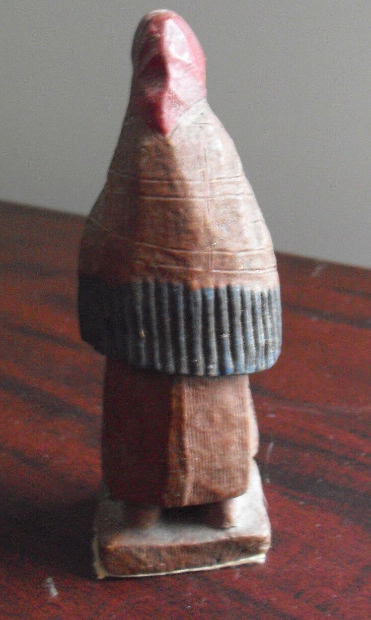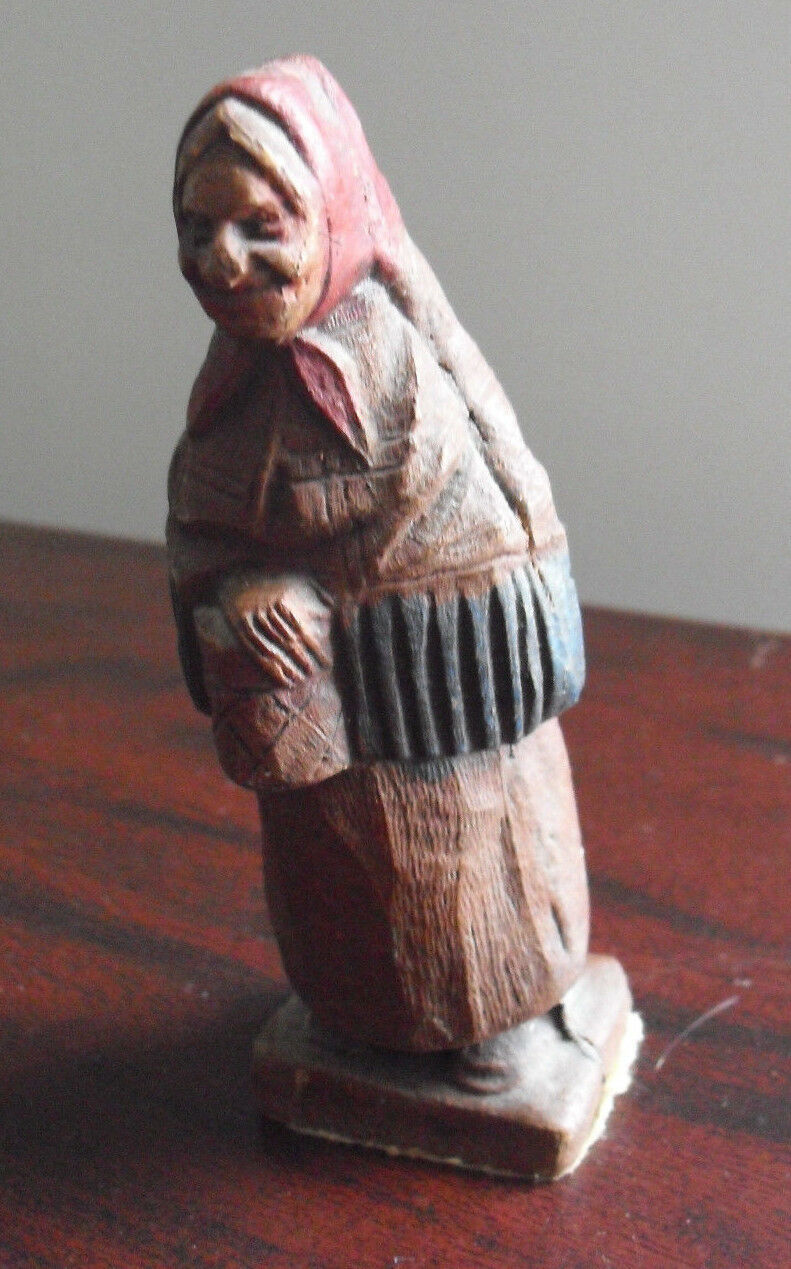 Unique vintage, 1940s era, wood composite material, Syroco wood, strange elderly woman holding a basket in her arm. Good shape with a chipped nose end, light general wear, crack forming on the lower midline on the base. It's about 4 1/2 inches tall.