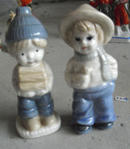 Very nice, vintage, unmarked, hollow bottom, lot of 2 figurines, a boy holding a pile of wood and a girl holding a duck. Great shape, could use a little fine cleaning. About 3 3/4 inches tall.