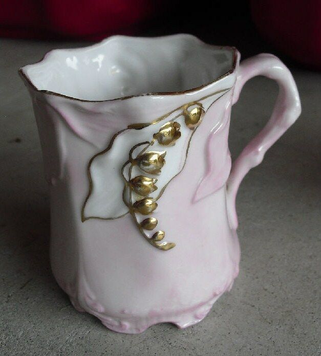 This is a cool, early porcelain or china, fancy pink with simple gold embossed flower design, coffee mug in the picture. a 245 is embossed on the bottom. Cool, old piece in great shape. Could use a little fine cleaning. About 3 3/4 inches tall.