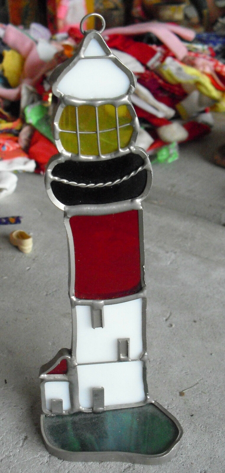 You are bidding on a very nice, and unusual, circa 1970s era, stained glass lighthouse with hook on top so it can be hung on a wall. Cool piece in very ncie shape with light wear. About 7 inches tall.