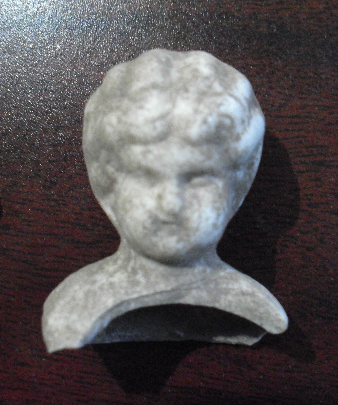 Very nice, very early 1900s if not older, German bisque girl doll head, broken off unevenly at the shoulders. Looks pretty nice, just needs a good cleaning. Head is about 1 inch tall.