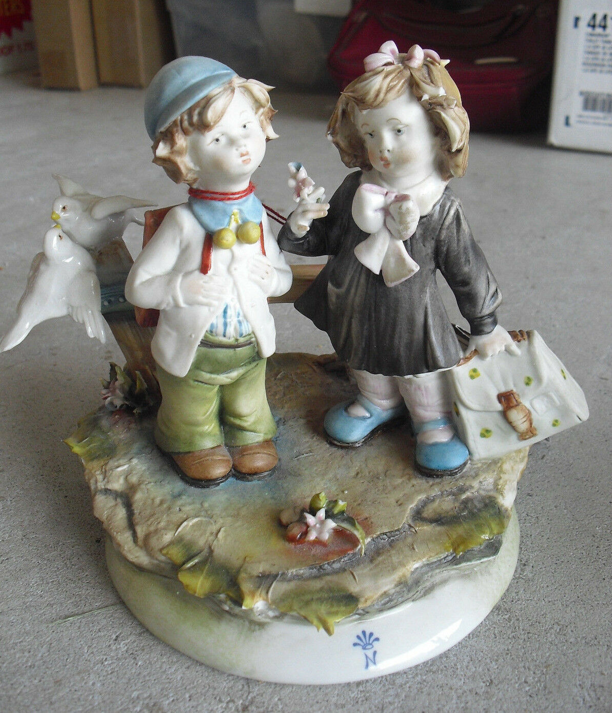 Very neat, and very hard to find, fine porcelain bisque figurine with hangtag. Base is marked Capodimonte by Quio Pezzoto. It's a super cute figurine of a young boy and girl with the girl holding a flower and luggage bag and a post fence behind them with two birds on it. Overall in very good shape with several chipped petals on all three of the flowers on the base, two chipped hair tips on her head. Glue residue on the underside where it was attached to a base a one point, and it could use a fine cleaning. It's not perfect, but the chipped trim flowers do not detract from the beauty of this piece. About 6 inches tall and 7 inches wide and heavy.