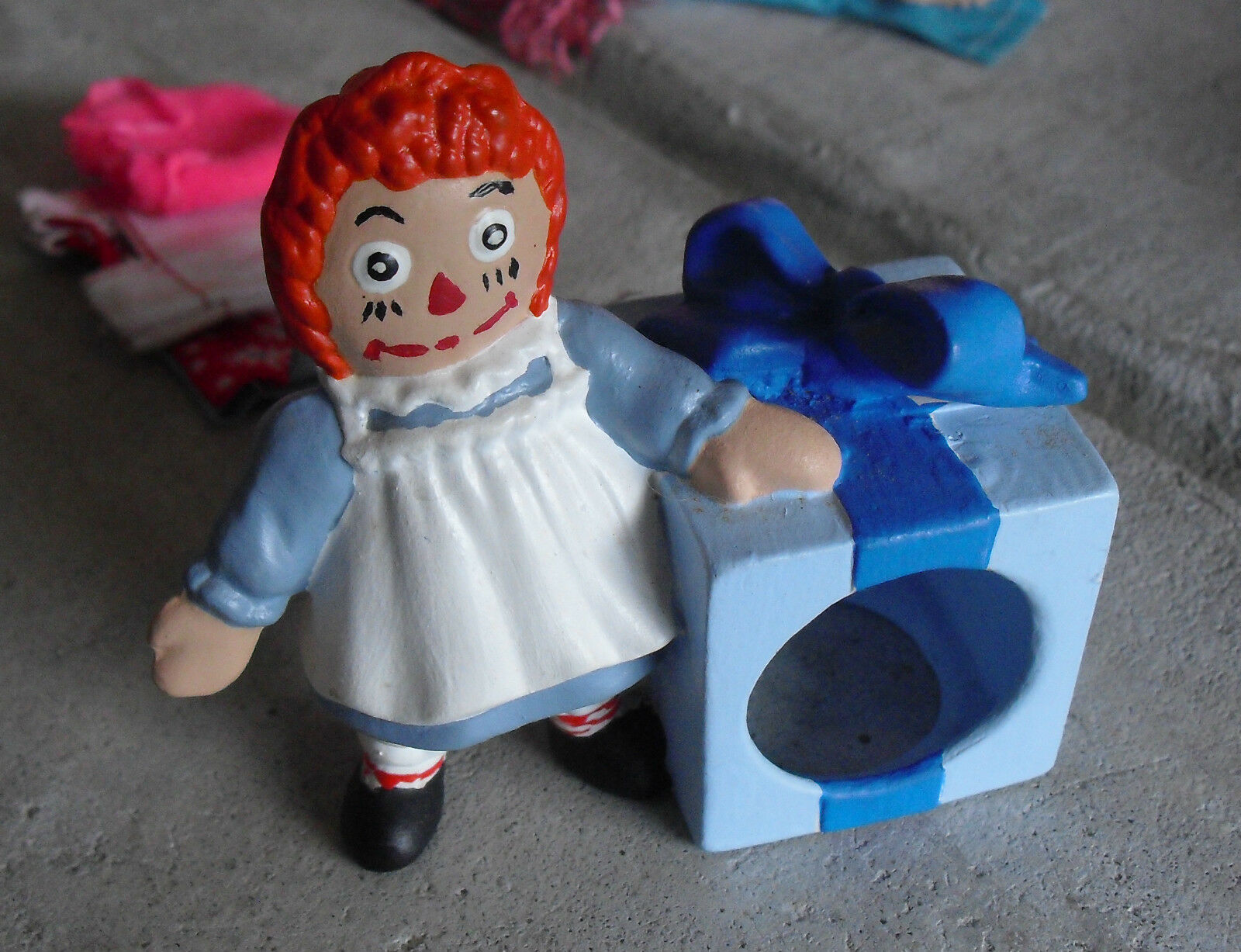 You are bidding on a cool 1974 dated, small, oddball ceramic Raggedy Ann character figure. About 3 inches tall and in very ncie shape.