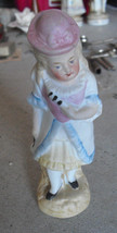 Very neat, vintage hollow bottom, porcelain bisque, girl or woman with pink hat figurine figurine in the picture. Neat piece in nice shape with a small rough spot, maybe edge chip on the back of the dress, very light wear and could use a little fine cleaning. No maker marks. About 5 3/8 inches tall.
