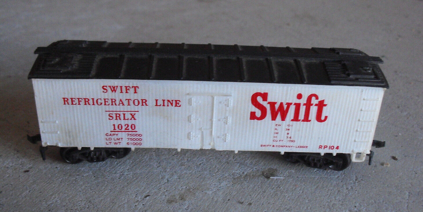 You are bidding on a circa 1980s era, plastic, Life Like marked, HO Scale, Swift SRLX 1020 box car in the picture. Very good shape with light wear, 3 of the 4 lower steps are broken off, and could use a little fine cleaning. Zoom in for details. About 5 1/2 inches long.