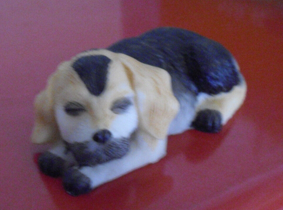 Very unique, modern resin brown and black, eyes closed puppy dog lying down sleeping figurine in the picture. About 1 inch tall and 2 3/4 inches long. Great shape.