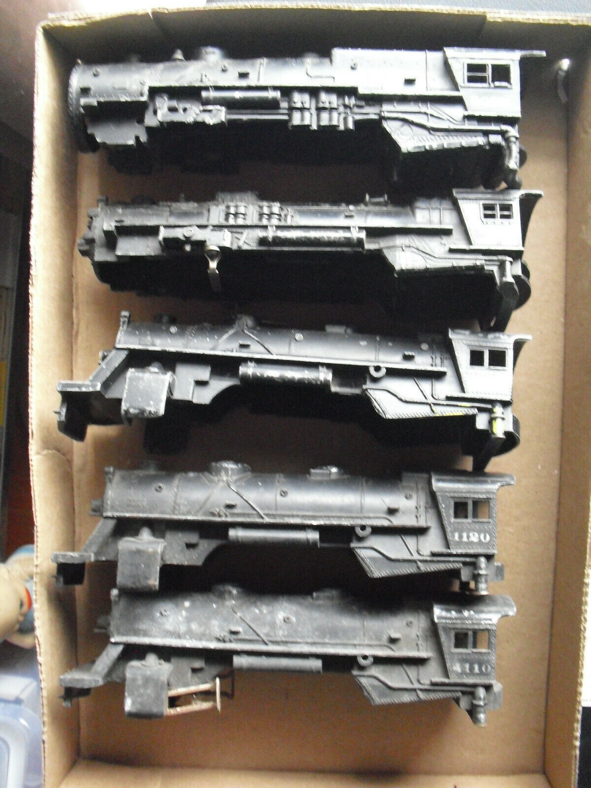 are bidding on an old lot of 5 of the O scale, heavy diecast Lionel bodies, 1110, 1120, 2084, one unnumbered or I can't make it out, and 2035. Light general wear, 2035 is missing the boiler plate, all have paint chips, nicks throughout, general wear, could use a general cleaning. Zoom in for condition.