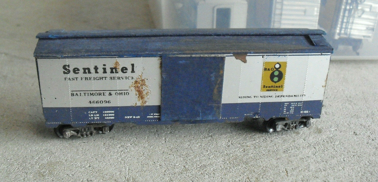 are bidding on a very nice, old, circa 1950s to 1960s era, HO scale, kit built wood with thin metal sides, B O Sentinel 466096 box car in the picture. 5 5/8 inches long. Overall very good shape, missing trim including the side ladders and lower steps, doors glued on sides so no door guide pieces, no couplers, light paint wear with some surface rusting on both sides, more modern plastic trucks. Zoom in for details.