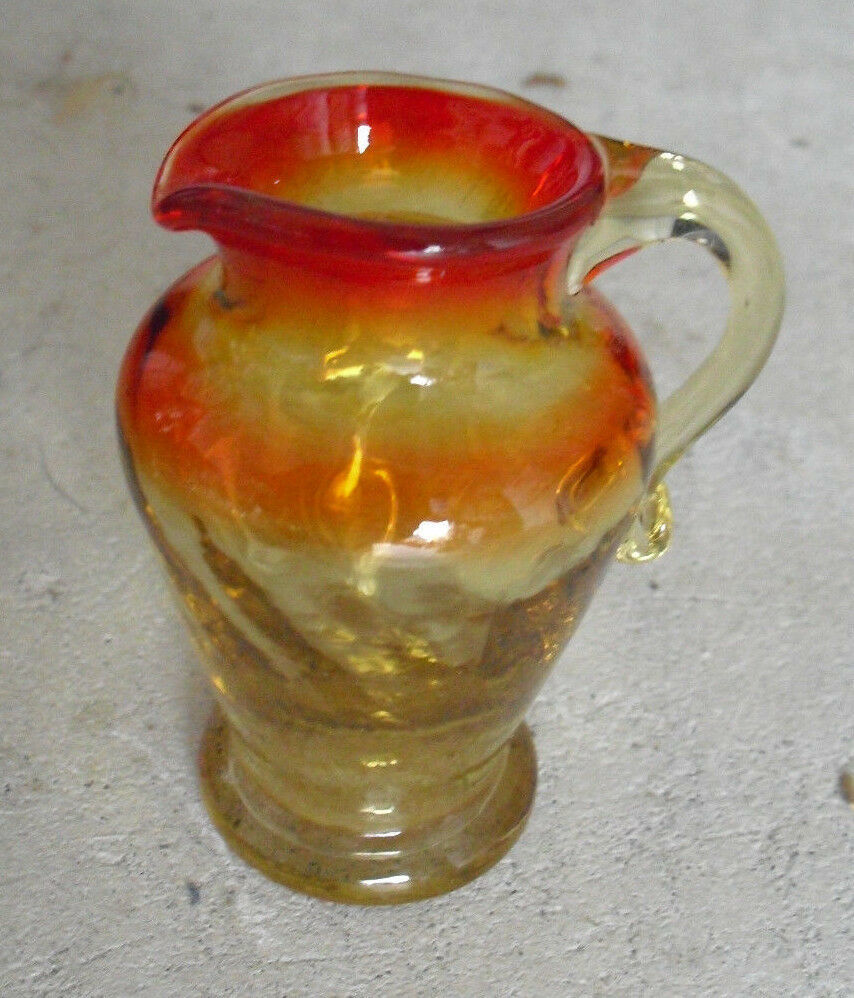 Cool, vintage, red to amber or yellowish color, small art glass pitcher or creamer in the picture. Really a neat piece in great shape, could use a little fine cleaning. No maker or artist marks seen. About 3 1/2 inches tall.