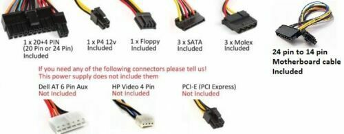 INCLUDES A 24 PIN to 14 PIN Main Motherboard conversion cable plus the following power supply:
