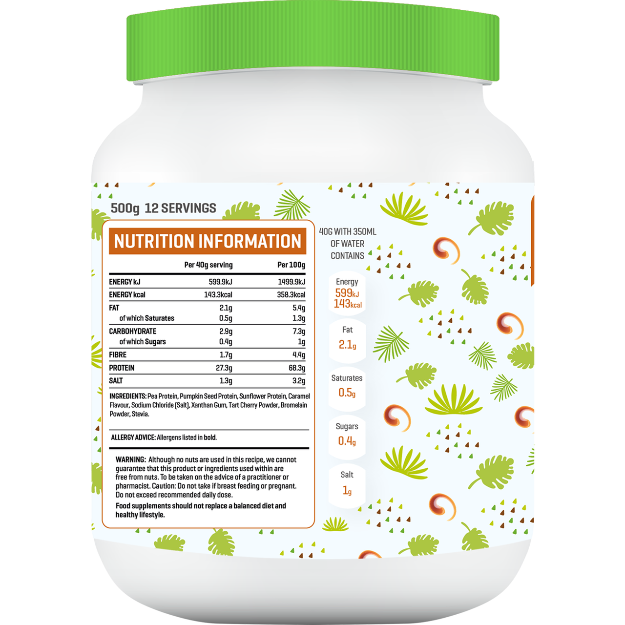 Our Salted Caramel High Plant Protein powder contains a whopping 27.3g of protein per 40g serving. There are no added sugars, has a low carb content, (virtually no sugar from carbs) and only 143 calories. Dairy free, gluten free, preservative, colour and additive free.
