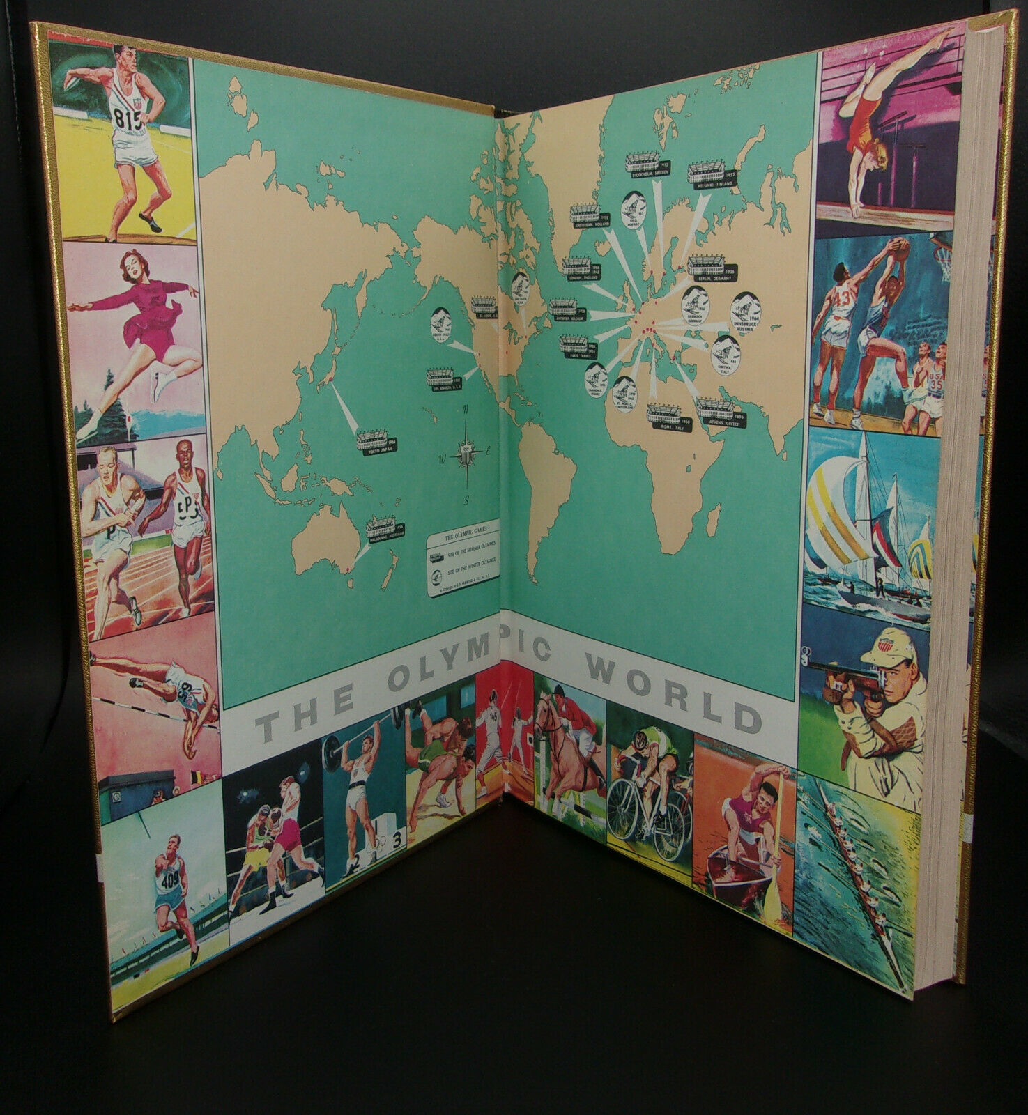 Lightly rubbed to the upper and lower spine edges, else nearly fine in textured gold-foil boards with gray titles to a black black panel circled by leaves, a shield and a torch to the front cover and with reverse gold foil titles and a shield to a black full spine panel, end-papers illustrated with a color map bordered by 17 bright color Olympic action scenes; in a very good plus rubbed dust jacket with faint tan spotting to the spine panel, and light rubbing at the upper and lower spine edges, spine folds and flap folds.s.