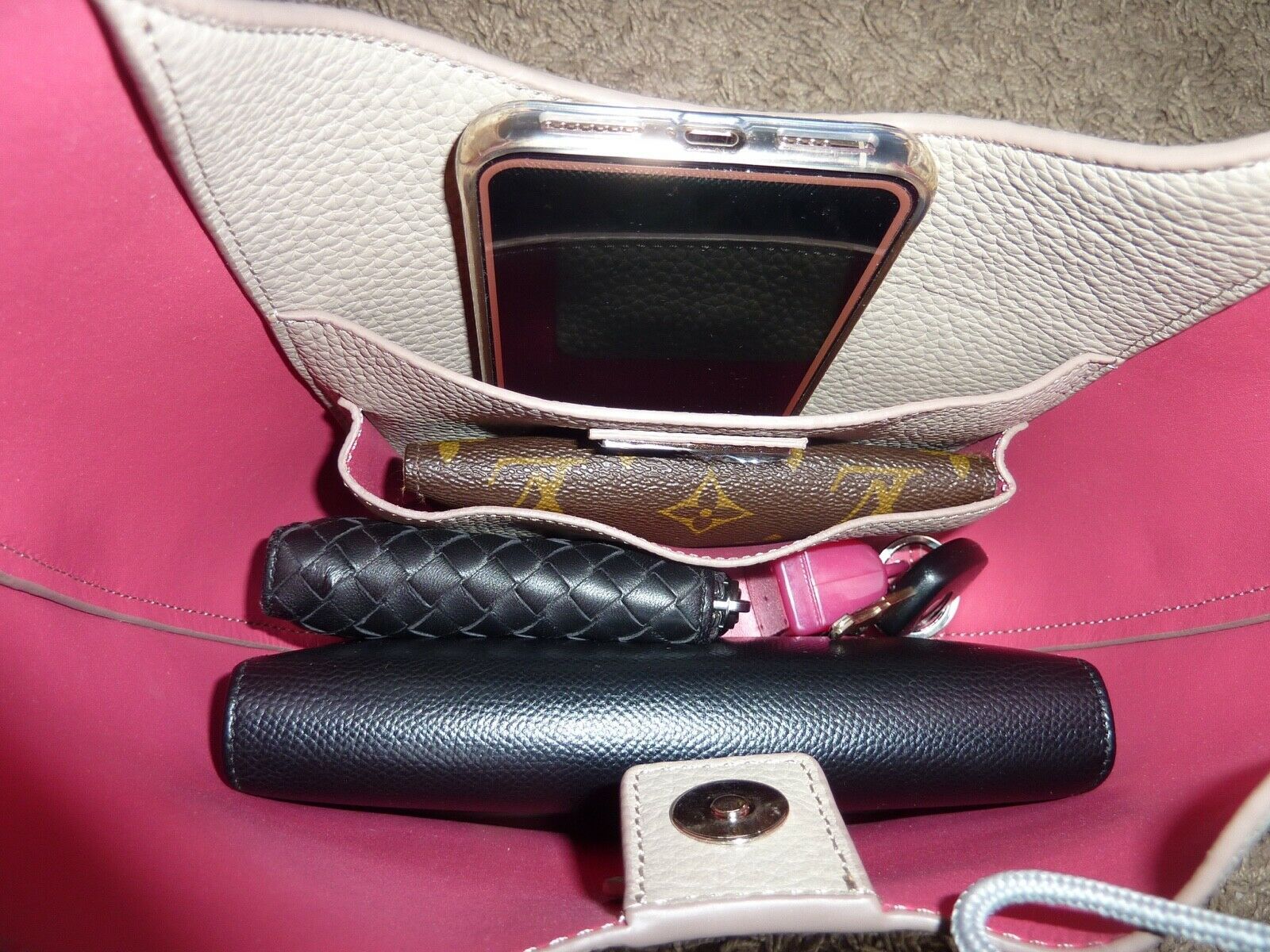 This bag is made of gray color pebbled genuine leather with pink interior.