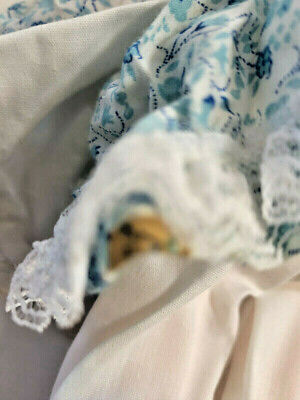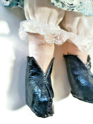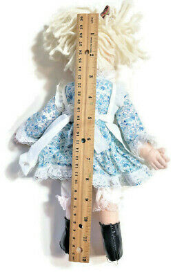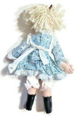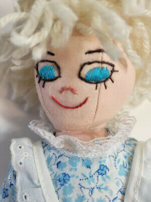 Vintage Handmade Folk Art Doll Felt Fabric Yarn Hair Blue Dress Apron