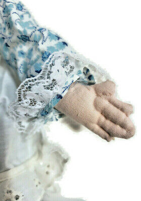 ? Color: Light tan, blue eyes, light yellow hair. Dress is blue print with white apron and black shoes.