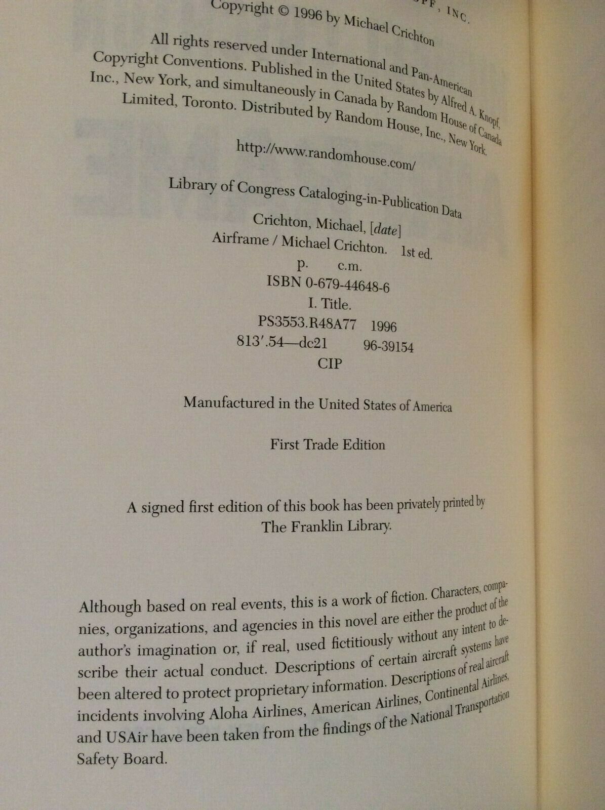 AIRFRAME by MICHAEL CRICHTON - HARDCOVER - FIRST TRADE EDITION