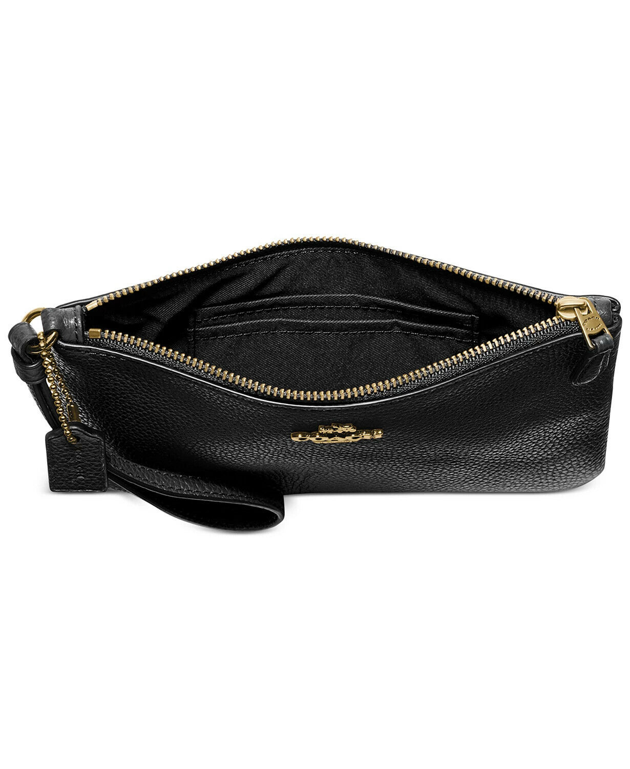 A little luxe: Polished pebble leather lends a rich hand feel to a versatile COACH wristlet that fits most phones.