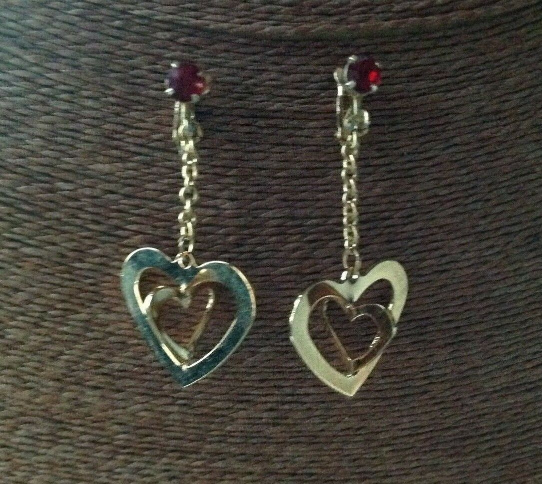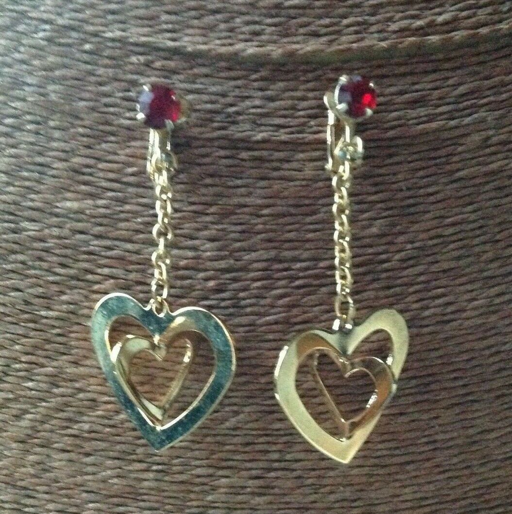 Heart Dangle Drop AVON Gold Tone Red Rhinestones Clip On Earrings