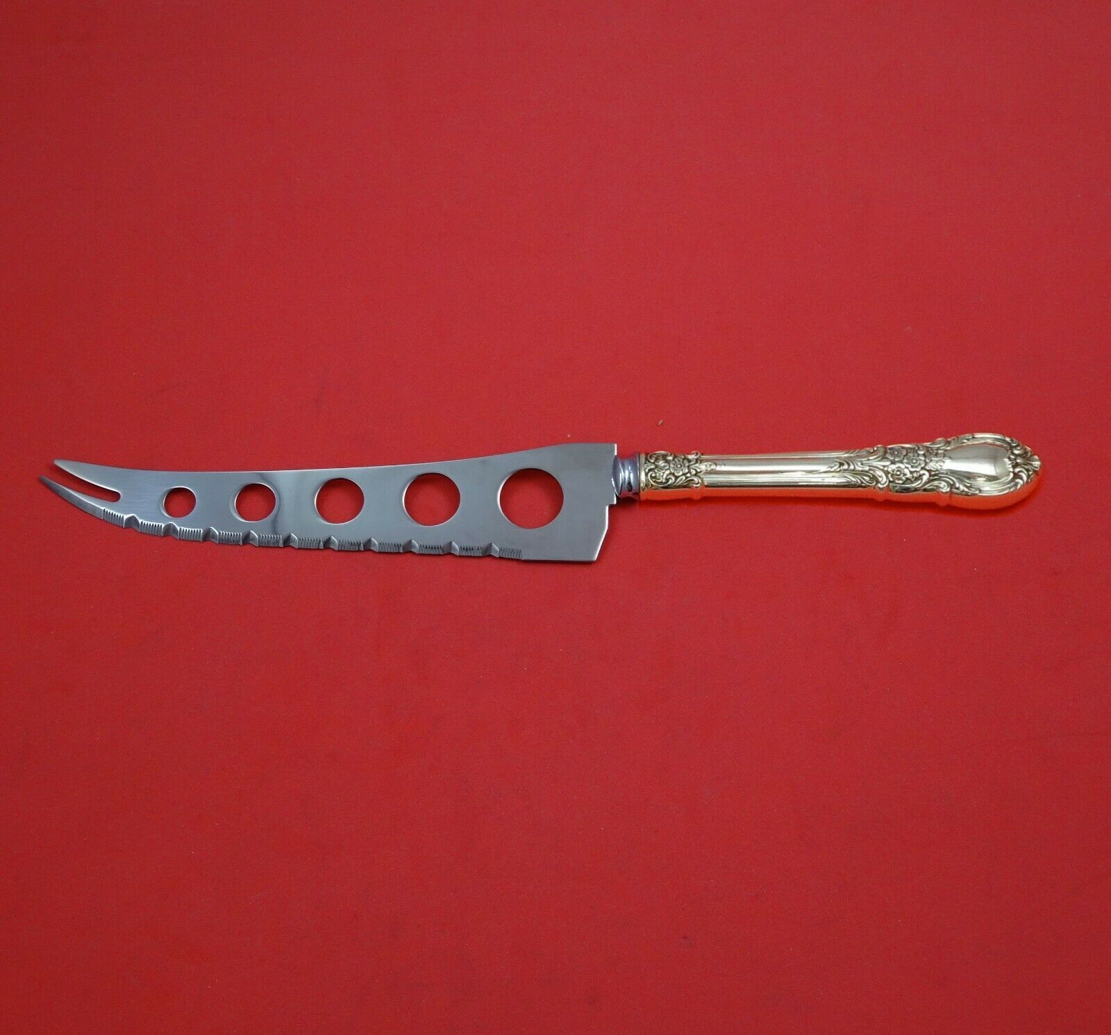 Large Charcuterie Knife, 9 3/4" with sterling silver hollow handle and a 5 1/2" stainless, serrated, tapered blade with pick custom made in the pattern American Victorian by Lunt. The blade features 5 circle piercings to help prevent soft cheese from sticking to the blade. This piece is for slicing and serving items found on a charcuterie board including: cheese, sausage, fruit, and more.