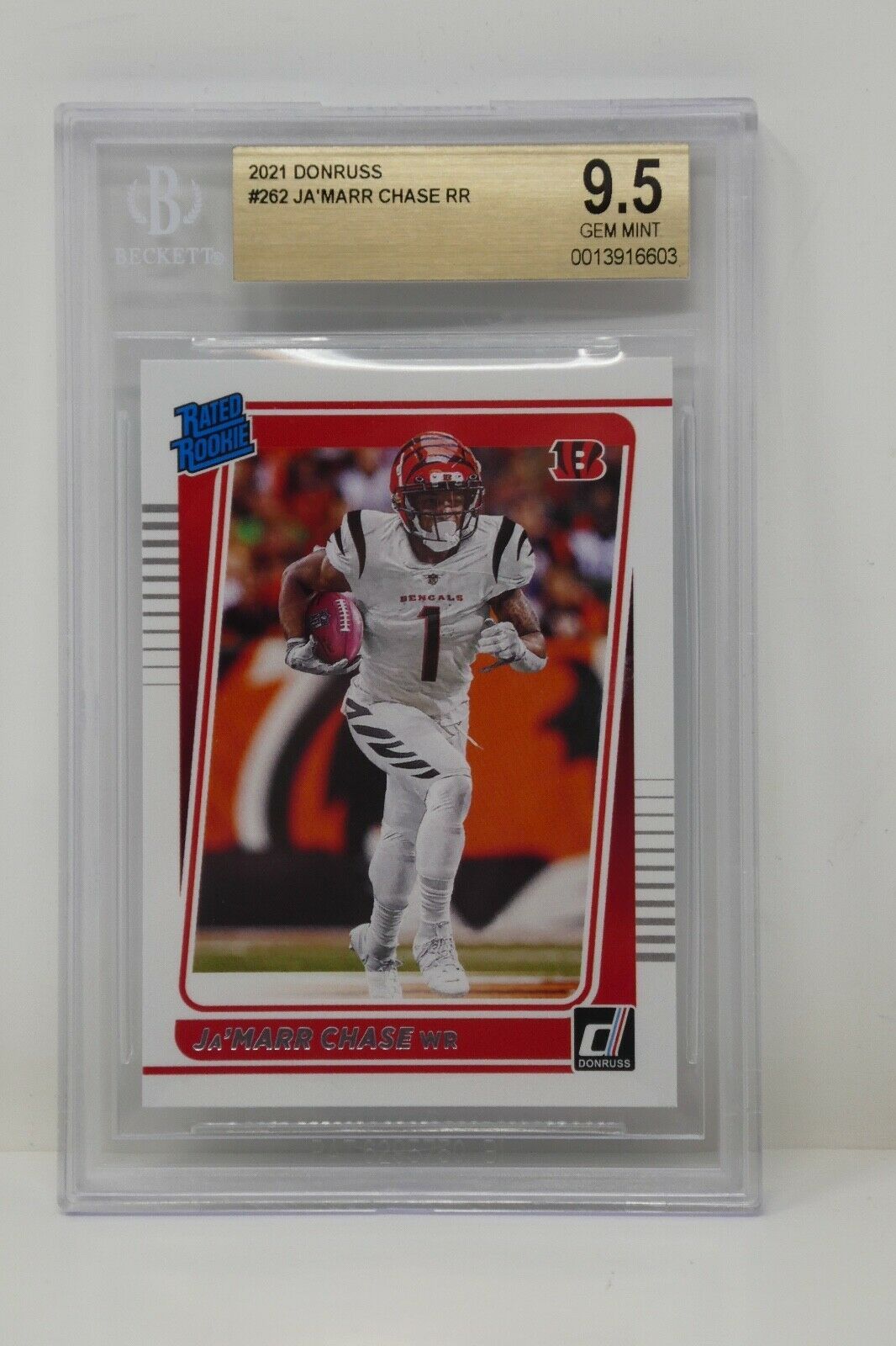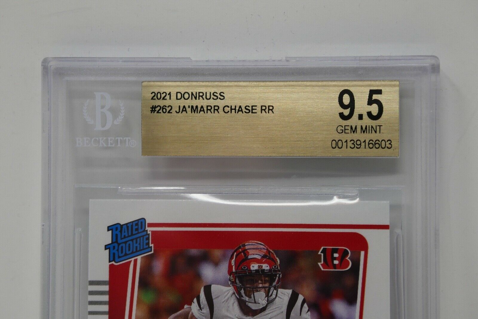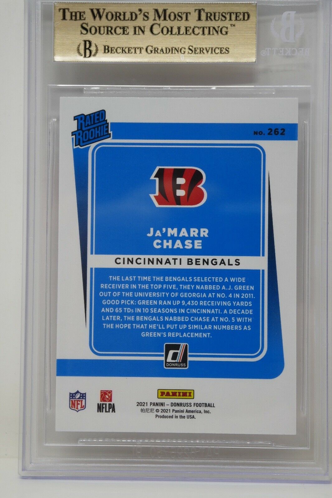 Up for sale is a 2021 Panini Donruss #262 Ja?Marr Chase Rated Rookie Trading Card. This has been graded by Beckett.