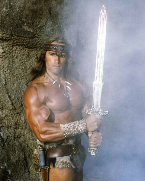 Arnold Schwarzenegger holds the gleaming sword as Conan The Barbarian poster