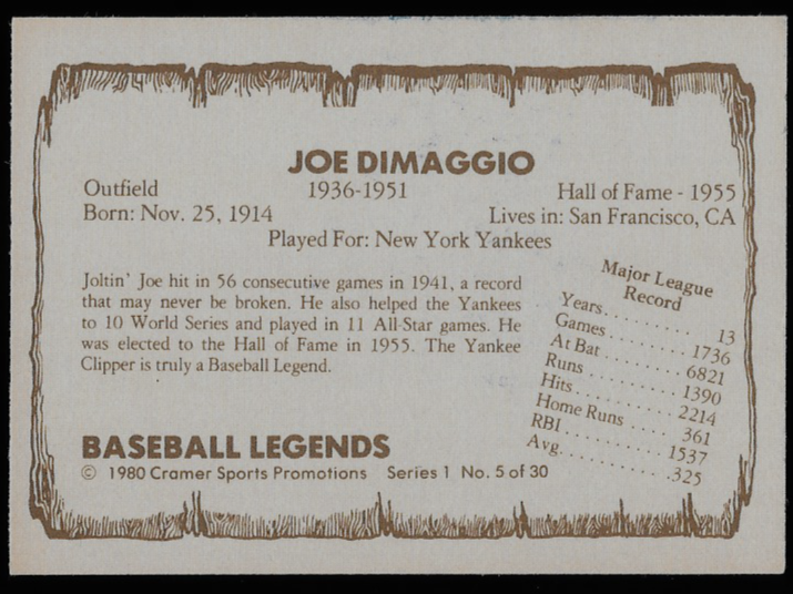 Joe DiMaggio autograph signed 1980 Baseball Legends card Yankees