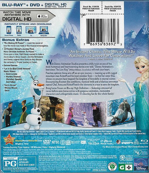 Plot: Fearless optimist Anna sets off on an epic journey, teaming up with rugged mountain man Kristoff and his loyal reindeer Sven, to find her sister Elsa, whose icy powers have trapped the kingdom of Arendelle in eternal winter. Encountering Everest-like conditions, mystical trolls and a hilarious snowman named Olaf, Anna, and Kristoff battle the elements in a race to save the kingdom. Blu-ray feature + bonus, DVD feature + bonus. 020922-020922P-DVD3