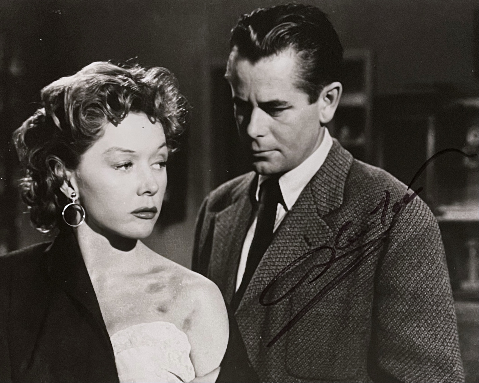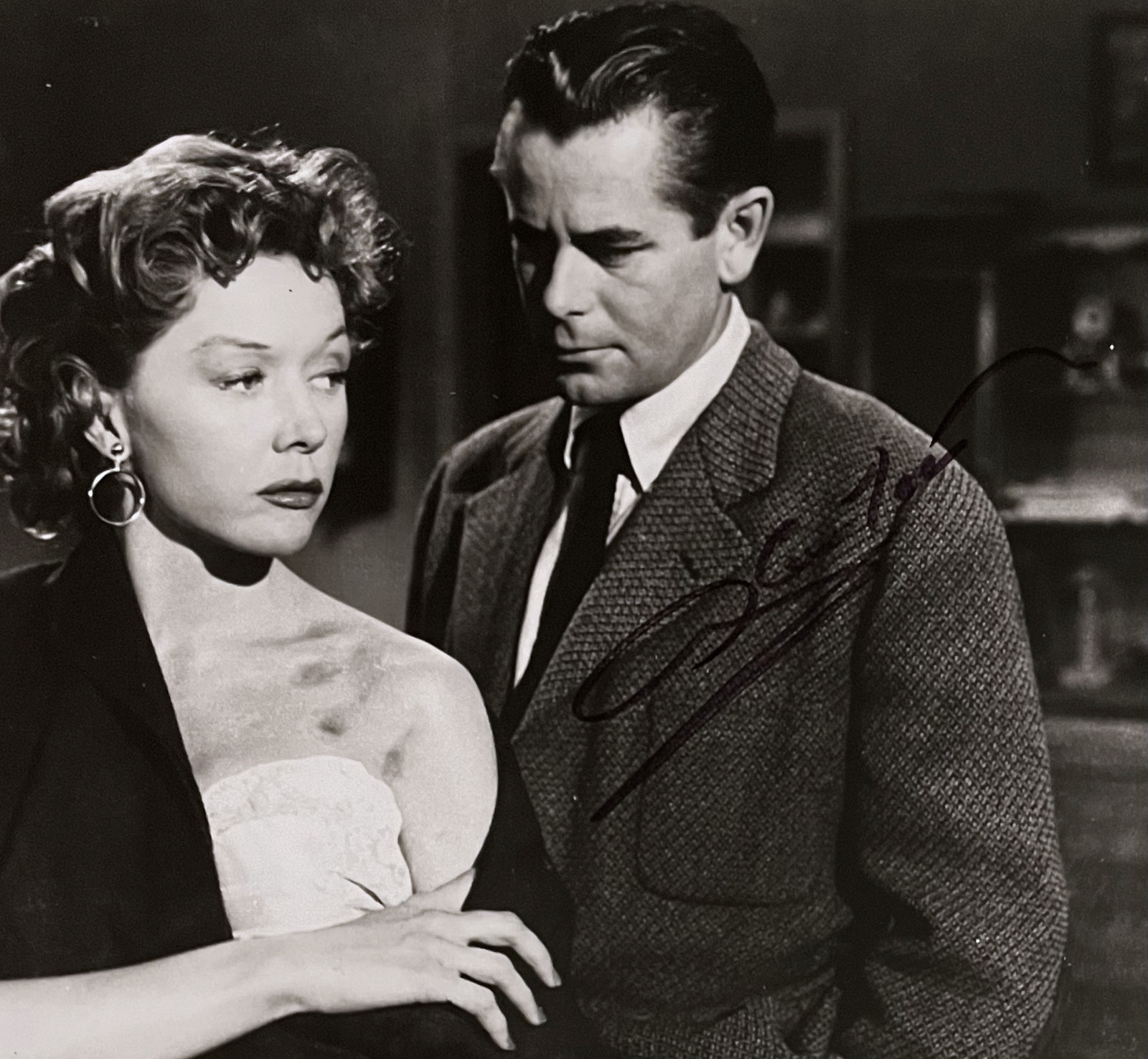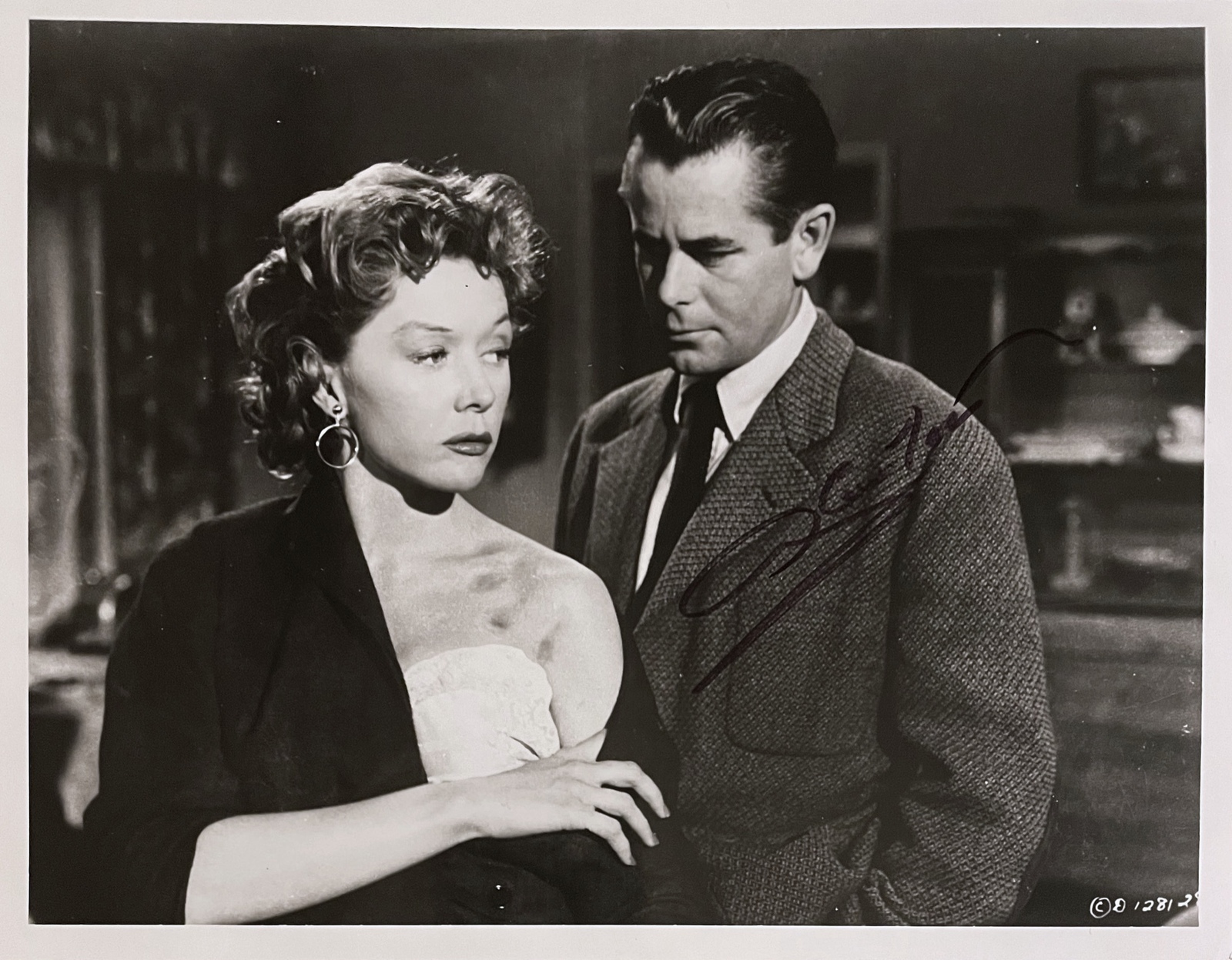 Glenn Ford autographed 8x10 vintage photo hand signed in black felt tip marker from the 1954 film Human Desire pictured with Gloria Grahame. This signature has been authenticated by JSA James Spence authentication Certification Number: XX48247 and will come with the Letter of Authenticity you see in the scan. This photo is in very good condition and will come in a clear hard top load for display. Glenn Ford was a Canadian-American actor who often portrayed ordinary men in unusual circumstances. Ford was prominent during Hollywood’s Golden Age as one of the biggest box-office draws of the 1940s, 1950s, and 1960s, who had a career that lasted more than 50 years. Known for Gilda (1946), 3:10 to Yuma (1957), The Big Heat (1953), The Fastest Gun Alive (1955), Jubal (1956), Cimarron (1960), Affair in Trinidad (1952), Midway (1976) and many more.