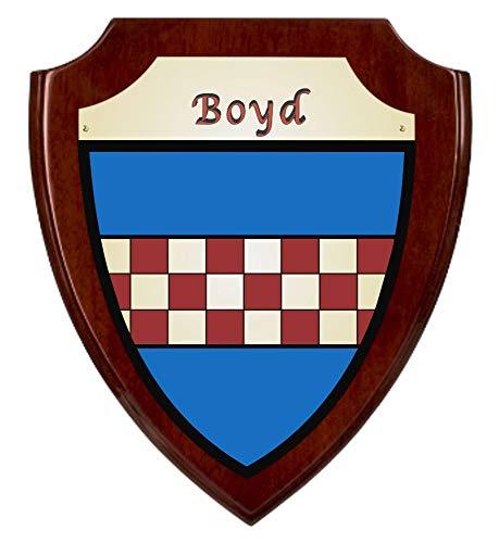 Boyd Irish Coat of Arms Shield Plaque - Rosewood Piano FinishThis piece of your family'??s Irish history is true to how it may have been originally used, painted in bright colors across a protective shield, turning a simple protective weapon into a symbol of honor, and as a way to recognize the fallen.Your authentic Irish family coat of arms is permanently imprinted in full color on a brass toned shield, which is then affixed with three brass screws to a handsome 8" x 10" Rosewood Piano Finish plaque. It will arrive ready to mount on any wall and to silently pay homage to the history of your Irish family. Choose from over 1000 available family coat of arms.Rosewood Piano FinishImprinted 4-color on a brass shield plateShield plate fastened with three brass screws8"wide x 10"highBackside - felt backingReady to hangChoose from over 1000 Irish crests