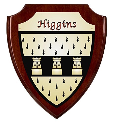 Product description: Higgins Irish Coat of Arms Shield Plaque - Rosewood Piano FinishThis piece of your family'??s Irish history is true to how it may have been originally used, painted in bright colors across a protective shield, turning a simple protective weapon into a symbol of honor, and as a way to recognize the fallen.Your authentic Irish family coat of arms is permanently imprinted in full color on a brass toned shield, which is then affixed with three brass screws to a handsome 8" x 10" Rosewood Piano Finish plaque. It will arrive ready to mount on any wall and to silently pay homage to the history of your Irish family. Choose from over 1000 available family coat of arms.Rosewood Piano FinishImprinted 4-color on a brass shield plateShield plate fastened with three brass screws8"wide x 10"highBackside - felt backingReady to hangChoose from over 1000 Irish crests