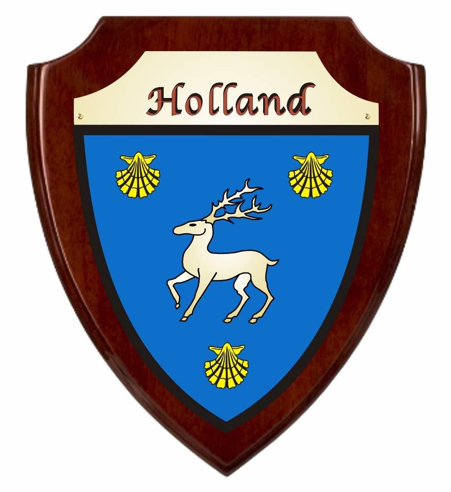 Holland Irish Coat of Arms Shield Plaque - Rosewood Piano FinishThis piece of your family'??s Irish history is true to how it may have been originally used, painted in bright colors across a protective shield, turning a simple protective weapon into a symbol of honor, and as a way to recognize the fallen.Your authentic Irish family coat of arms is permanently imprinted in full color on a brass toned shield, which is then affixed with three brass screws to a handsome 8" x 10" Rosewood Piano Finish plaque. It will arrive ready to mount on any wall and to silently pay homage to the history of your Irish family. Choose from over 1000 available family coat of arms.Rosewood Piano FinishImprinted 4-color on a brass shield plateShield plate fastened with three brass screws8"wide x 10"highBackside - felt backingReady to hangChoose from over 1000 Irish crests