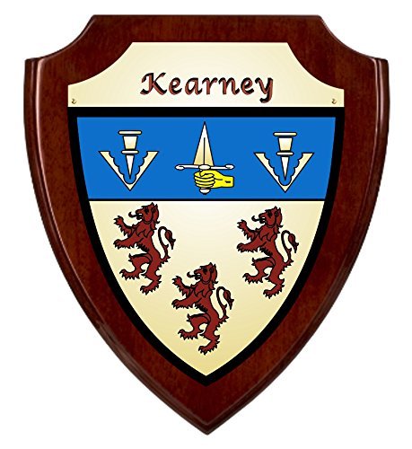 Kearney Irish Coat of Arms Shield Plaque - Rosewood Piano FinishThis piece of your family'??s Irish history is true to how it may have been originally used, painted in bright colors across a protective shield, turning a simple protective weapon into a symbol of honor, and as a way to recognize the fallen.Your authentic Irish family coat of arms is permanently imprinted in full color on a brass toned shield, which is then affixed with three brass screws to a handsome 8" x 10" Rosewood Piano Finish plaque. It will arrive ready to mount on any wall and to silently pay homage to the history of your Irish family. Choose from over 1000 available family coat of arms.Rosewood Piano FinishImprinted 4-color on a brass shield plateShield plate fastened with three brass screws8"wide x 10"highBackside - felt backingReady to hangChoose from over 1000 Irish crests