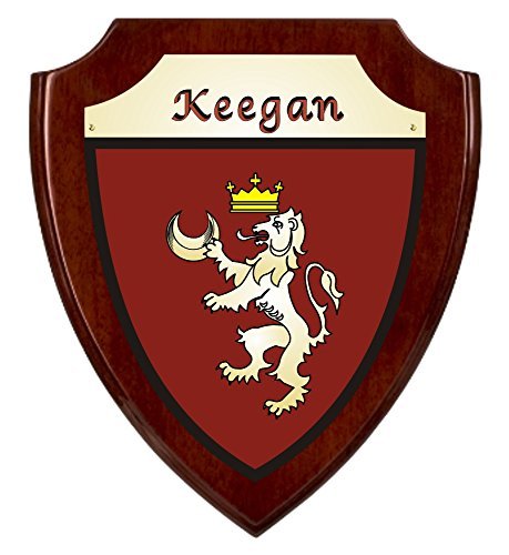 Keegan Irish Coat of Arms Shield Plaque - Rosewood Piano FinishThis piece of your family'??s Irish history is true to how it may have been originally used, painted in bright colors across a protective shield, turning a simple protective weapon into a symbol of honor, and as a way to recognize the fallen.Your authentic Irish family coat of arms is permanently imprinted in full color on a brass toned shield, which is then affixed with three brass screws to a handsome 8" x 10" Rosewood Piano Finish plaque. It will arrive ready to mount on any wall and to silently pay homage to the history of your Irish family. Choose from over 1000 available family coat of arms.Rosewood Piano FinishImprinted 4-color on a brass shield plateShield plate fastened with three brass screws8"wide x 10"highBackside - felt backingReady to hangChoose from over 1000 Irish crests