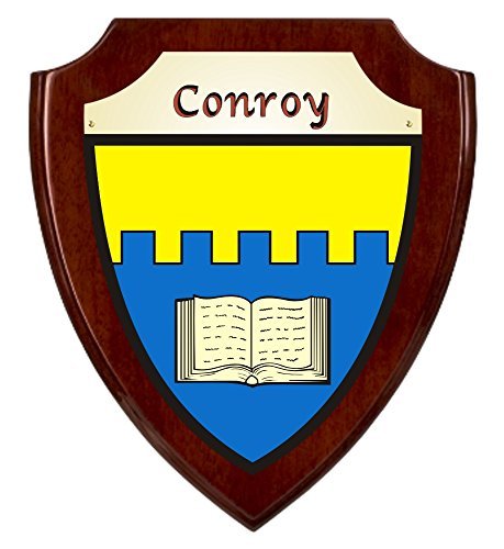 Conroy Irish Coat of Arms Shield Plaque - Rosewood Piano FinishThis piece of your family'??s Irish history is true to how it may have been originally used, painted in bright colors across a protective shield, turning a simple protective weapon into a symbol of honor, and as a way to recognize the fallen.Your authentic Irish family coat of arms is permanently imprinted in full color on a brass toned shield, which is then affixed with three brass screws to a handsome 8" x 10" Rosewood Piano Finish plaque. It will arrive ready to mount on any wall and to silently pay homage to the history of your Irish family. Choose from over 1000 available family coat of arms.Rosewood Piano FinishImprinted 4-color on a brass shield plateShield plate fastened with three brass screws8"wide x 10"highBackside - felt backingReady to hangChoose from over 1000 Irish crests
