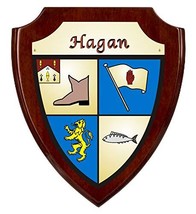 Hagan Irish Coat of Arms Shield Plaque - Rosewood Piano FinishThis piece of your family'??s Irish history is true to how it may have been originally used, painted in bright colors across a protective shield, turning a simple protective weapon into a symbol of honor, and as a way to recognize the fallen.Your authentic Irish family coat of arms is permanently imprinted in full color on a brass toned shield, which is then affixed with three brass screws to a handsome 8" x 10" Rosewood Piano Finish plaque. It will arrive ready to mount on any wall and to silently pay homage to the history of your Irish family. Choose from over 1000 available family coat of arms.Rosewood Piano FinishImprinted 4-color on a brass shield plateShield plate fastened with three brass screws8"wide x 10"highBackside - felt backingReady to hangChoose from over 1000 Irish crests