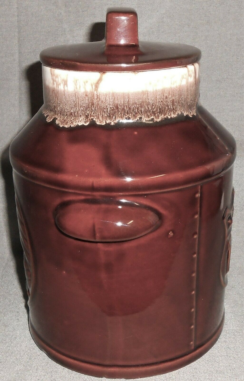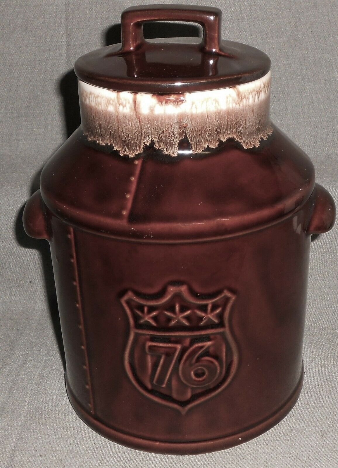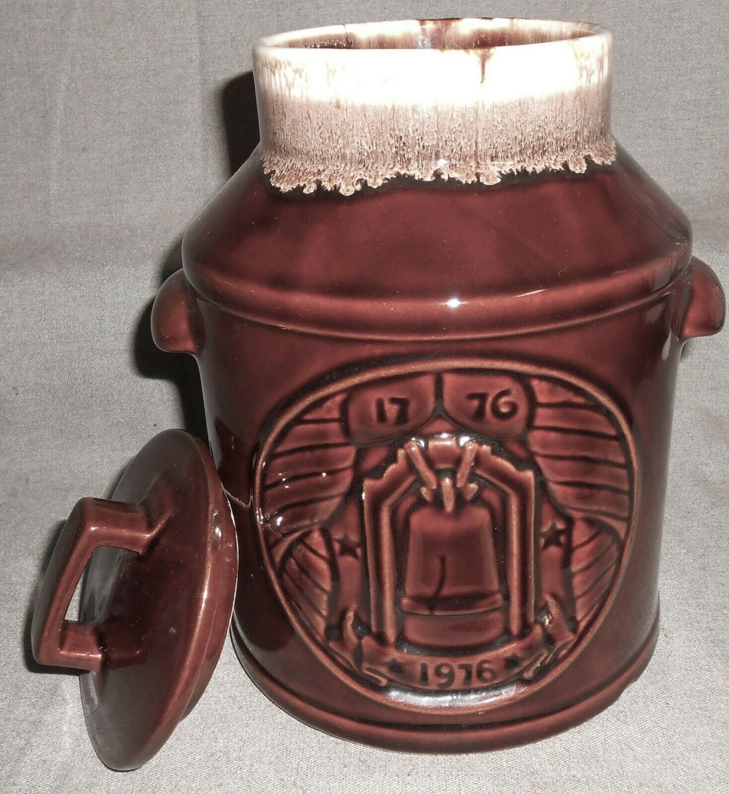 This is the Bi-Centennial Brown Milk Can Shaped Cookie Jar from McCoy Pottery that has the 1776-1976 Liberty Bell on one side and the 76 Emblem on the other. It measures approx 10 1/4" tall to handle on lid and approx 6 5/8" across at base. It has the # 154 on the base and it is in good pre-owned condition with no chips or cracks - Made in the USA. ***Bright White Spots from Camera/Lighting***